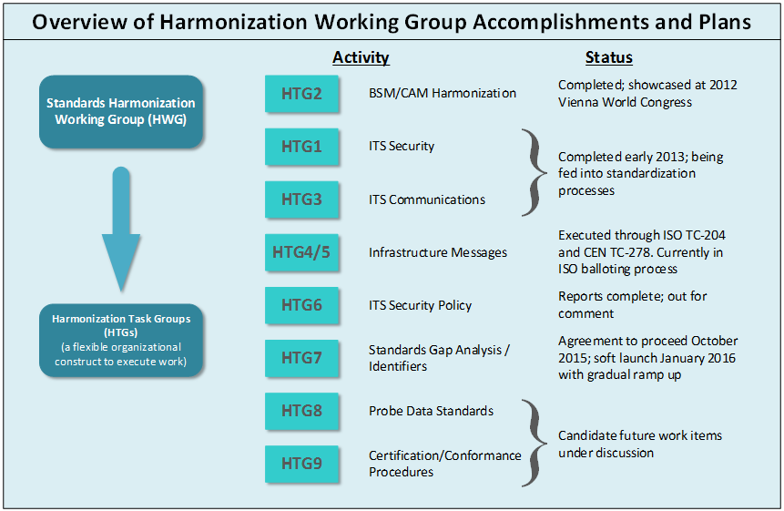 Harmonization Task Groups are created under a parent agreement that originated in 2011 between the EC and the US with the goal of supporting “wherever possible, global open standards in order to ensure interoperability of cooperative systems worldwide and to preclude the development and adoption of redundant standards.”